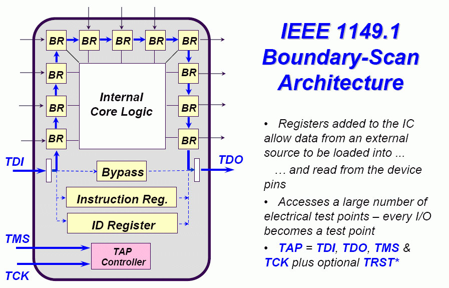 邊界掃描測試是一種可測試結(jié)構(gòu)技術(shù),它采用集成電路的內(nèi)部外圍所謂的“電子引腳”(邊界)模擬傳統(tǒng)的在線測試的物理引腳,對器件內(nèi)部進行掃描測試。它是在芯片的I/O端上增加移位寄存器,把這些寄存器連接起來,加上時鐘復(fù)位、測試方式選擇以及掃描輸入和輸出端口,而形成邊界掃描通道。IEEE 1149.1 標準規(guī)定了一個四線串行接口(第五條線是可選的),該接口稱作測試訪問端口 (TAP),用于訪問復(fù)雜的集成電路 (IC),例如微處理器、DSP、ASIC 和 CPLD 等。 在 TDI(測試數(shù)據(jù)輸入)引線上輸入到芯片中的數(shù)據(jù)存儲在指令寄存器中或一個數(shù)據(jù)寄存器中。 串行數(shù)據(jù)從 TDO(測試數(shù)據(jù)輸出)引線上輸出。 邊界掃描邏輯由 TCK(測試時鐘)上的信號計時,而且 TMS(測試模式選擇)信號控制驅(qū)動 TAP 控制器的狀態(tài)。 TRST*(測試重置)是可選項,可作為硬件重置信號,一般不用。詳細邊界掃描結(jié)構(gòu)及信號流程參考圖1。