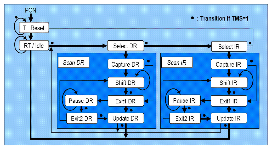 測試操作的最重要步驟是移入和同步移出測試數(shù)據(jù)(DR SHIFT),新的數(shù)據(jù)進入移位鏈,測試數(shù)據(jù)傳送到測試單元DR-update)的輸出鎖存器中,對于指令寄存器(IR-shift,IR-capture,IR-update)同樣如此。除了邊界掃描寄存器oundary Scan Register),IEEE 1149.1標準還定義了在數(shù)據(jù)寄存器附近至少存在一個旁路寄存器,用來將TDI 到TDO 的可以直連接。數(shù)據(jù)寄存器根據(jù)指令寄存器的指令尋址,然后在TDI 和TDO 的引腳之間,各個數(shù)據(jù)寄存器結(jié)合成移位路徑。正如圖2 所示,從一個狀態(tài)轉(zhuǎn)換成另一個狀態(tài)由信號TMS 的邏輯電平?jīng)Q定?!癟AP ”是一個時鐘系統(tǒng),它的時鐘是由信號TCK 提供。信號TMS 和信號TCK共同作用,使得數(shù)據(jù)一位一位從TDI 移入,最后由TDO 移出。 鋤?G羝!